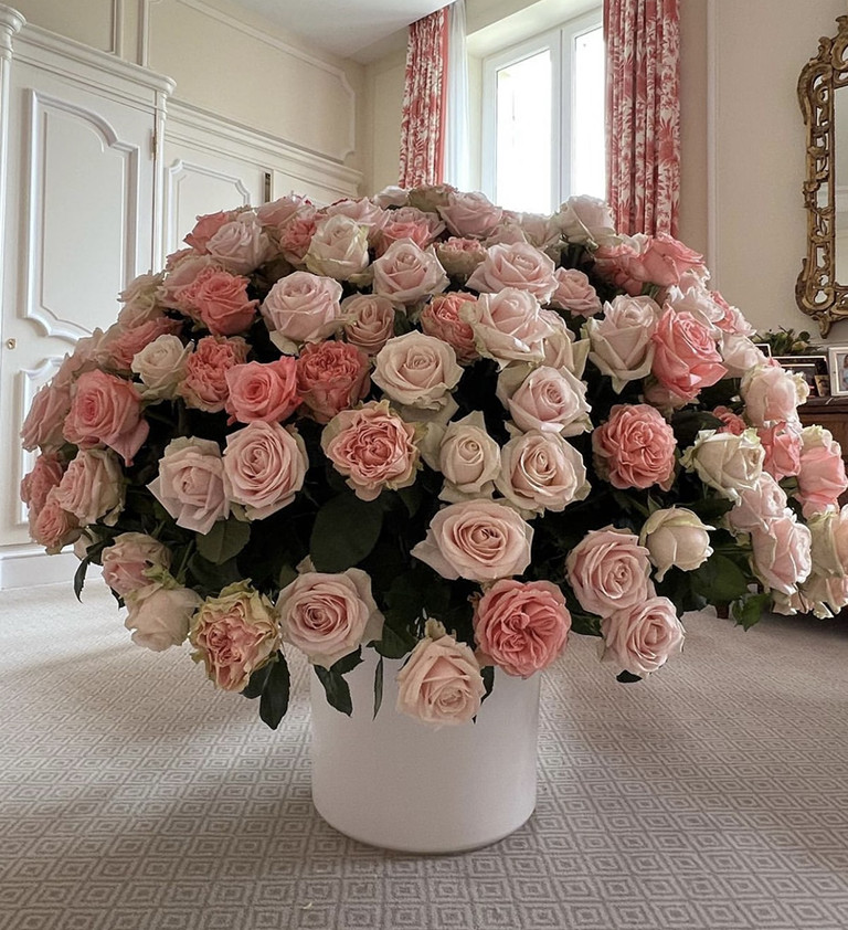 An elegant arrangement of hundreds of roses in soft shades of pink and cream. Girl with a Pearl Earring radiates sophistication, femininity, and harmony. Its noble palette and majestic volume make it the perfect choice for special declarations, anniversaries, or wedding celebrations.
