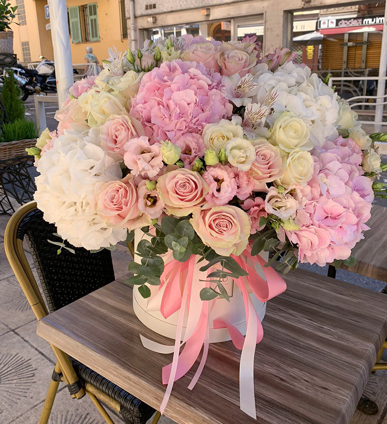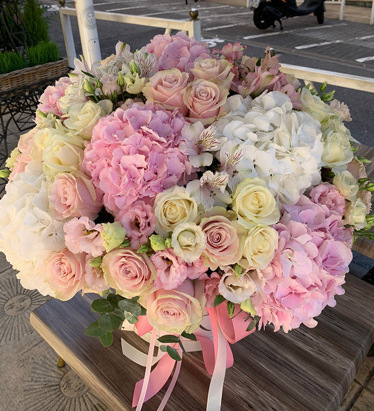 An exquisite arrangement in soft pink and white tones, featuring lush hydrangeas, delicate roses, and refined lisianthus. Mona Lisa reflects the mysterious charm and harmony of a timeless masterpiece — tenderness, elegance, and subtle allure.