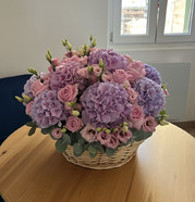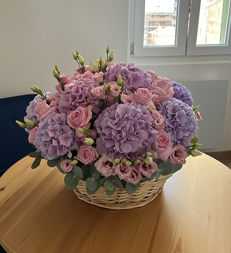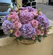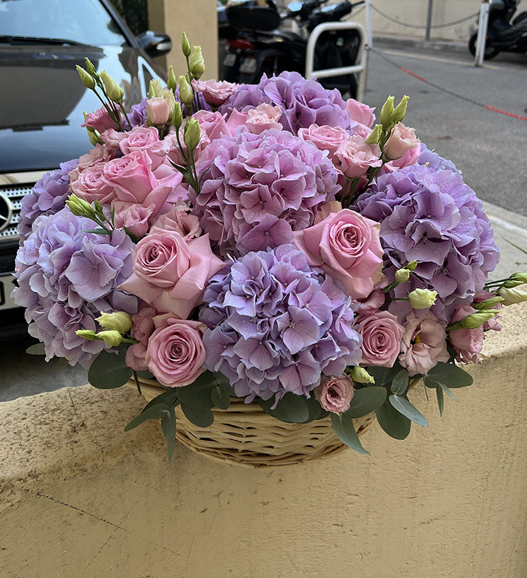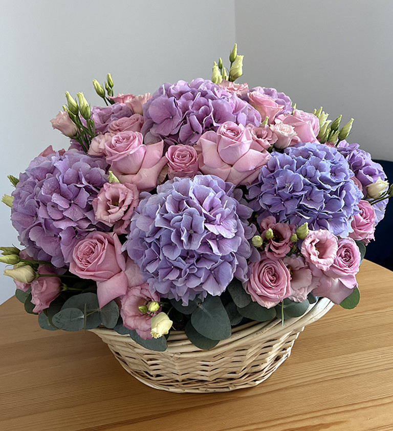 Элегантный букет в корзине, созданный в гармоничных оттенках сиреневого и розового. Пышные гортензии, нежные розы и изящные эустомы напоминают мерцающее ночное небо, наполненное сияющими звёздами.