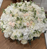 Монументальная композиция в белоснежной палитре с лёгкими кремовыми акцентами. В букете соединились пышные гортензии, утончённые розы, изящные эустомы и сезонные цветы. «Guernica» — это воплощение силы и гармонии, контраст между мягкостью оттенков и масштабом формы.